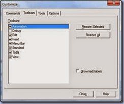 To add additional and more frequently used commands on the tool bar you can use Customize Window. To access the Customize Window, you navigate to Tools->Customize.You just need to drag and drop the required commands on the QTP tool bar. Using the Toolbars tab you can customize the availability of various handy command such as Automation, Debug etc. Please refer the below screen shots: